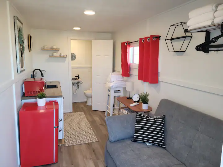 Check out this unique space in a 20 ft shipping container! Queen size bed and full bathroom along with a kitchenette perfect for a weekend or long term stay.